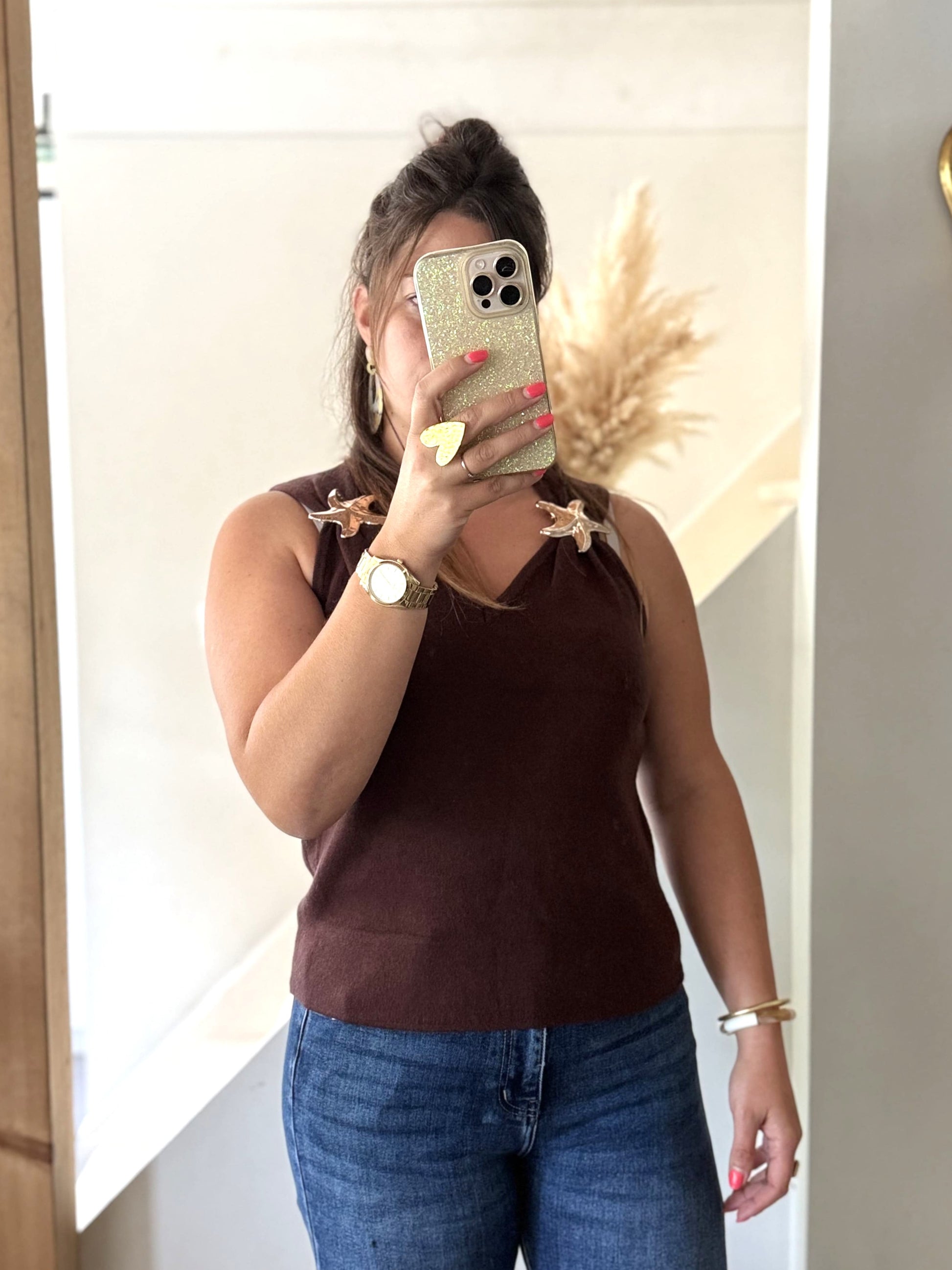 Le top Margot est la pièce chic et originale qui donne du caractère à ton look. Avec sa coupe sans manches et son col en V, il met en valeur la silhouette tout en restant confortable. Ses deux bijoux dorés façon étoile aux niveau des épaules apportent une touche élégante et raffinée.